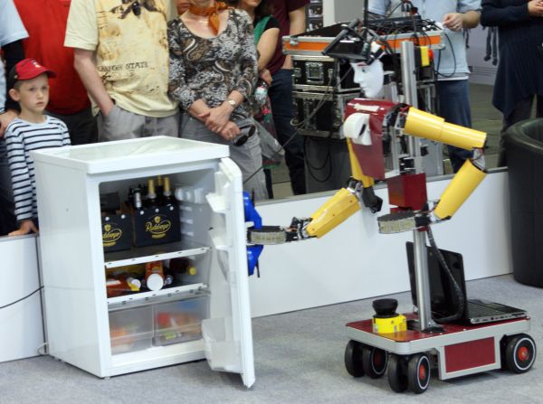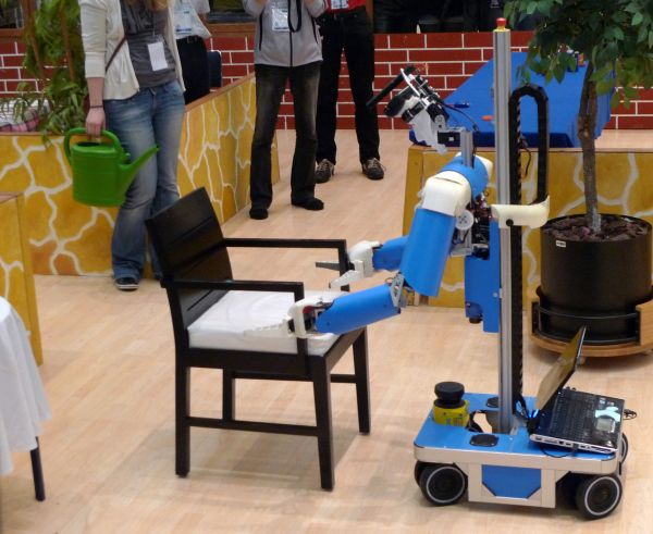 The video shows scenes from the 2012 RoboCup@Home competition, which took place in Mexico City. The cognitive service robots Dynamaid and Cosero of team NimbRo (University of Bonn, Germany) perform several tasks in a household environment, including serving drinks and watering a plant.